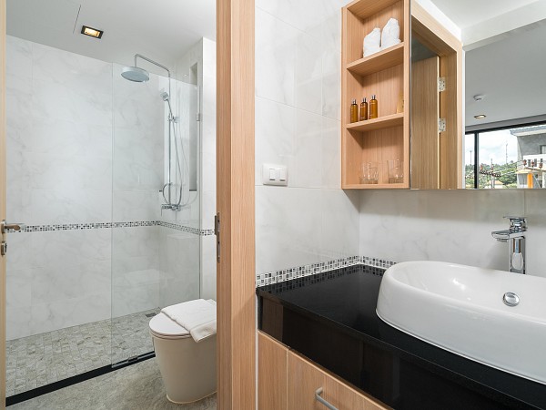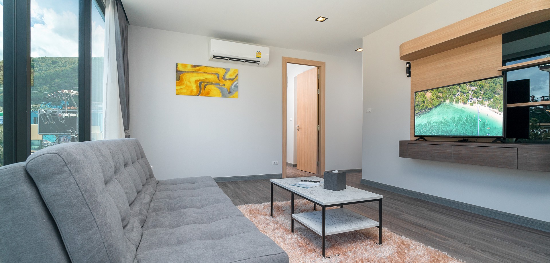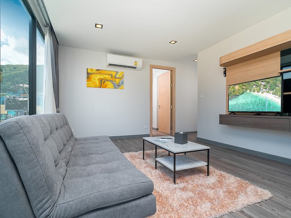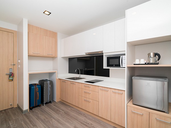 The homely room has an open-plan living room combination with sofa bed separated by partition, basic kitchenette with all amenities and spacious balcony with a coffee table set.